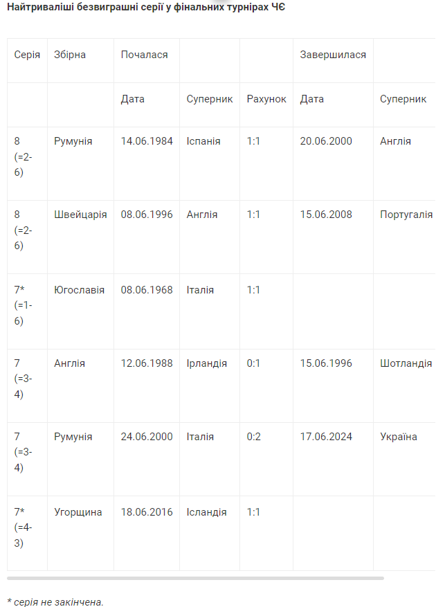 Румунія, розгромивши Україну (3:0), перервала 7-матчеву безвиграшну серію у фінальних турнірах чемпіонатів Європи (3 нічиї та 4 поразки). Тим самим румуни уникли повторення антирекорду Euro, який належить їм же на пару зі швейцарцями.