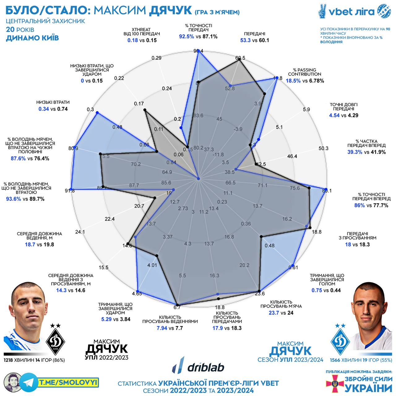 Звісно, не варто забувати про певне «видужання» Динамо, як механізму. Але Дячук навіть візуально не випадав, як в дебютні півроку, адже структура просувань мʼяча залишилася сталою (втратив в кількості лише 0.3/90), однак: