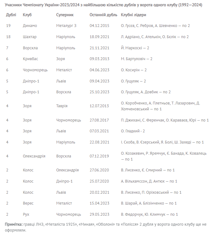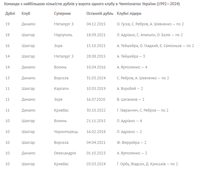 За всю історію Чемпіонатів України, якщо розподілити усі 1479 дублів по командам у ворота одного клубу, то найврожайнішими вже понад вісім років залишаються протистояння «Динамо» та запорізького «Металургу», в яких 19 разів відзначалися дуплетисти столичного гранду.