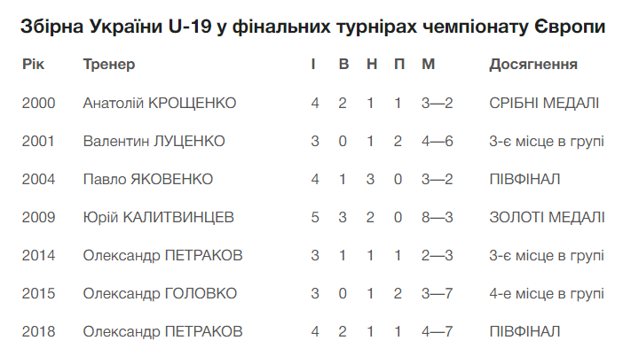 Варто відзначити, що найчастіше збірна України U-19 (а потім — U-20) досягала успіхів під керівництвом Олександра Петракова. З ним вона двічі пробилася у фінальний турнір Євро і брала бронзу у 2018-му, з ним двічі грала на ЧС U-20 (2015 — 1/8 фіналу, 2019 — золото).