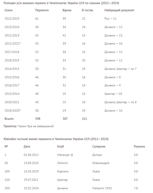 Минулий юнацький Чемпіонат увібрав в себе і ювілейну, 200-у (!), розгромну вікторію команд-гостей за всю історію проведення цих змагань. Сталася ця історична подія 25 лютого цього року, коли «Динамо» перемогло «Металіст 1925» з рахунком 7:0.