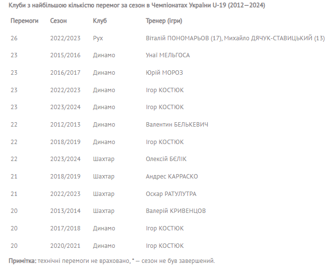 Минулий Чемпіонат України U-19 підкорегував планки багатьох клубних рекордів. Юнаки «Динамо» здобули 23 перемоги в ході Чемпіонату, четвертий раз повторивши клубний рекорд за сезон.