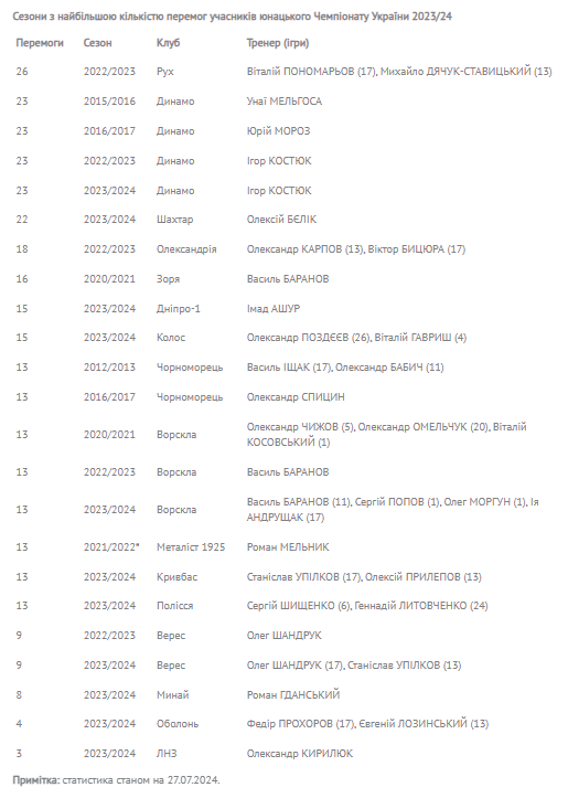 Крім юнаків «Динамо», повторили клубні рекорди представники «Ворскли» (13 перемог) та «Вереса» (9).
