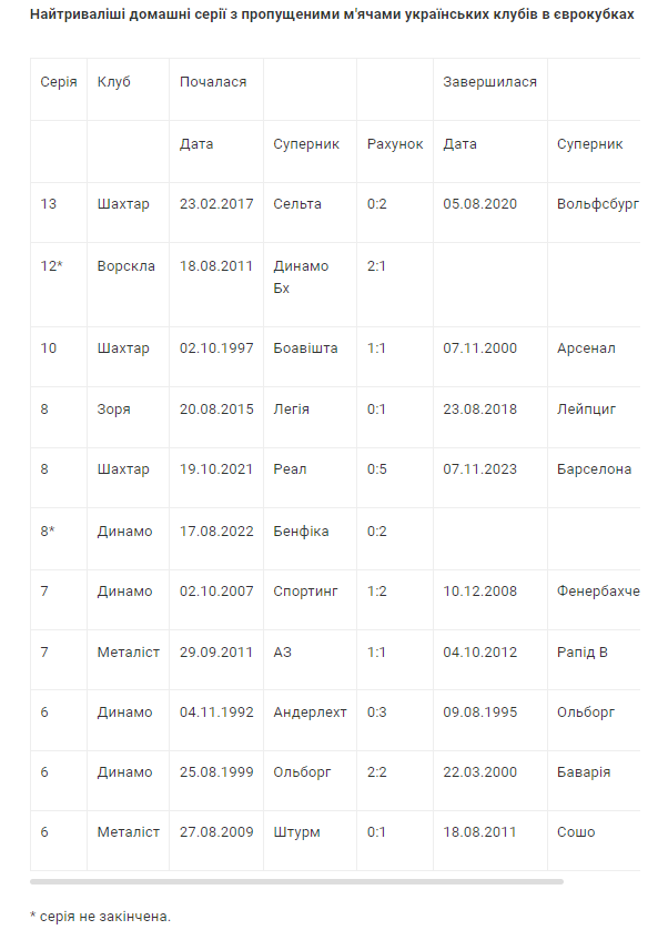 Серед українських команд більш тривалі серії з пропущеними м'ячами мали лише «Шахтар» (двічі) та «Ворскла».