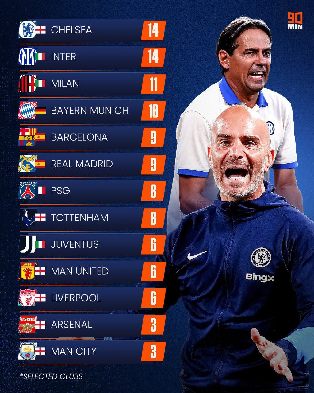 За цей час у лондонців та міланців змінилося 14 наставників. Далі йдуть "Мілан" (11), "Баварія" (10), "Барселона" (9), "Реал" (9), ПСЖ (8), "Тоттенхем" (8), "Ювентус" (6), МЮ (6), "Ліверпуль" (6), "Арсегал" (3), "МанчестерСіті" (3).