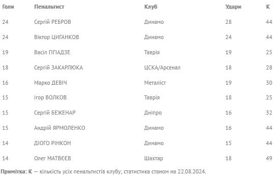 Очолюють цей рейтинг забивних пенальтистів саме представники «Динамо» — Сергій Ребров та Віктор Циганков — по 24 голи.