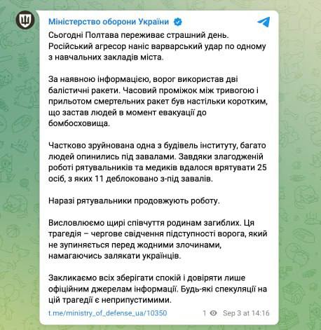 Сьогодні росіяни завдали удару 2 балістичними ракетами по навчальному закладу у Полтаві, підтвердили в Міноборони. Наразі відомо про 41-го загиблого та 180 поранених.