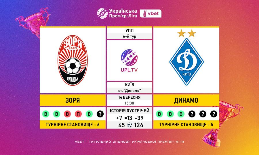 Матч 6-го туру Української Прем’єр-ліги "Зоря" — "Динамо": статистичне прев’ю