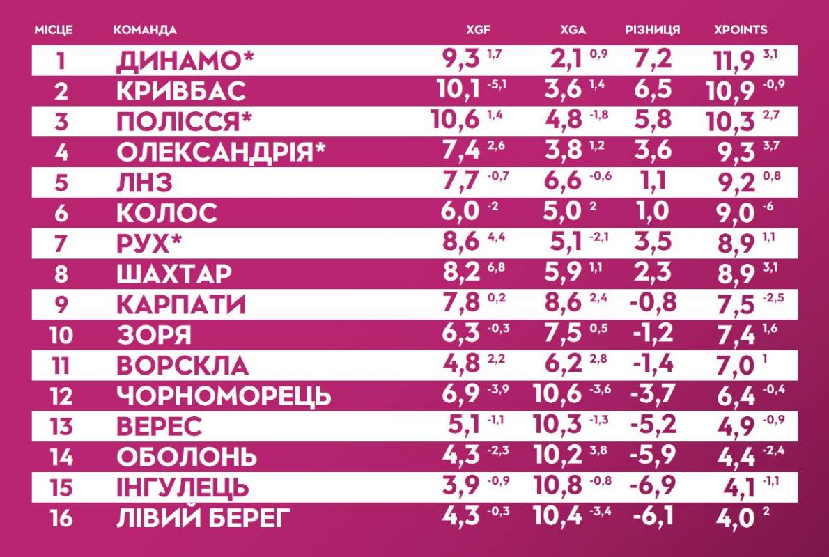 - в Рудька та ко різниця найбільша в УПЛ - на 3.6 голи менше