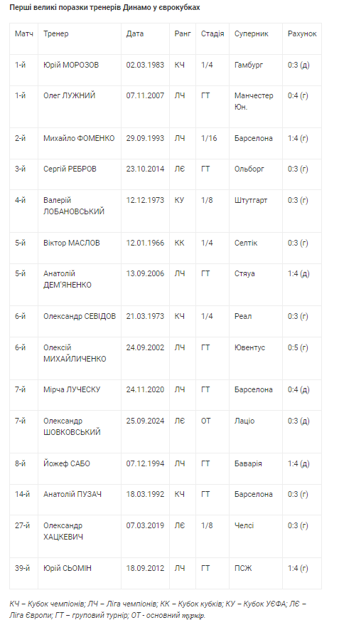 А ще трьом тренерам киян взагалі вдалося уникнути великих «проколів» у єврокубках – Олегу Блохіну (у 17 матчах), Валерію Газзаєву (у 12) та Леоніду Буряку (у 2-х).