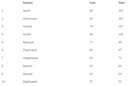 Країни, чиї клуби забили найбільше голів українським командам у єврокубках (1965—2024)