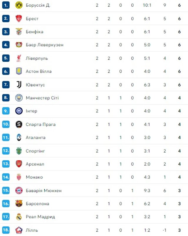 За підсумками неповних двох турів дортмундська Борусія, Брест, Бенфіка, Байєр, Ліверпуль, Астон Вілла та Ювентус очолили турнірну таблицю Ліги чемпіонів. Тільки ці сім команд зуміли набрати максимальну кількість очок – по 6. Вони на два пункти випередили таких суперників, як Манчестер Сіті, Інтер, Спарту, лісабонський Спортінг, Аталанту, Монако і Арсенал.