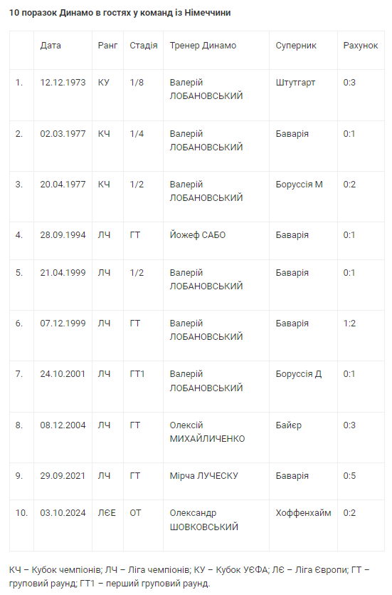 Поразка від «Хоффенхайма» (0:2) стала 10-ю для «Динамо» у гостьових баталіях із командами з Німеччини у єврокубкових турнірах. 8 разів кияни поступалися на виїзді німцям у Лізі (Кубку) чемпіонів та 2 – у Лізі Європі (Кубку УЄФА). 5 перемог над динамівцями здобула на своєму полі «Баварія», по 1 – «Байєр», «Боруссія» Дортмунд, «Боруссія» Менхенгладбах, «Хоффенхайм» та «Штутгарт».