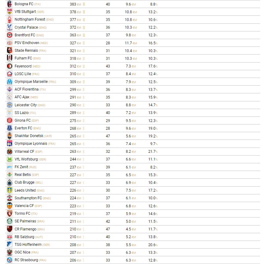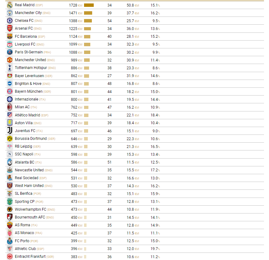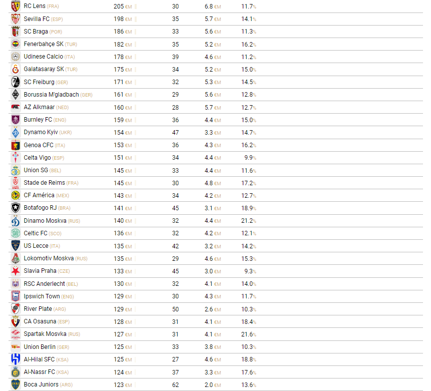 Міжнародний центр спортивних досліджень (CIES) опублікував рейтинг 100 клубів, чиї футболісти (включаючи гравців, відданих в оренду) мають найвищу сукупну трансферну вартість.