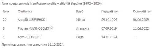 Лік «італійських» голів відкрив Андрій Шевченко, який 9 жовтня 1999 року представляв «Мілан» і відзначився в гостьовій грі в рамках відбору на ЧС-2000.