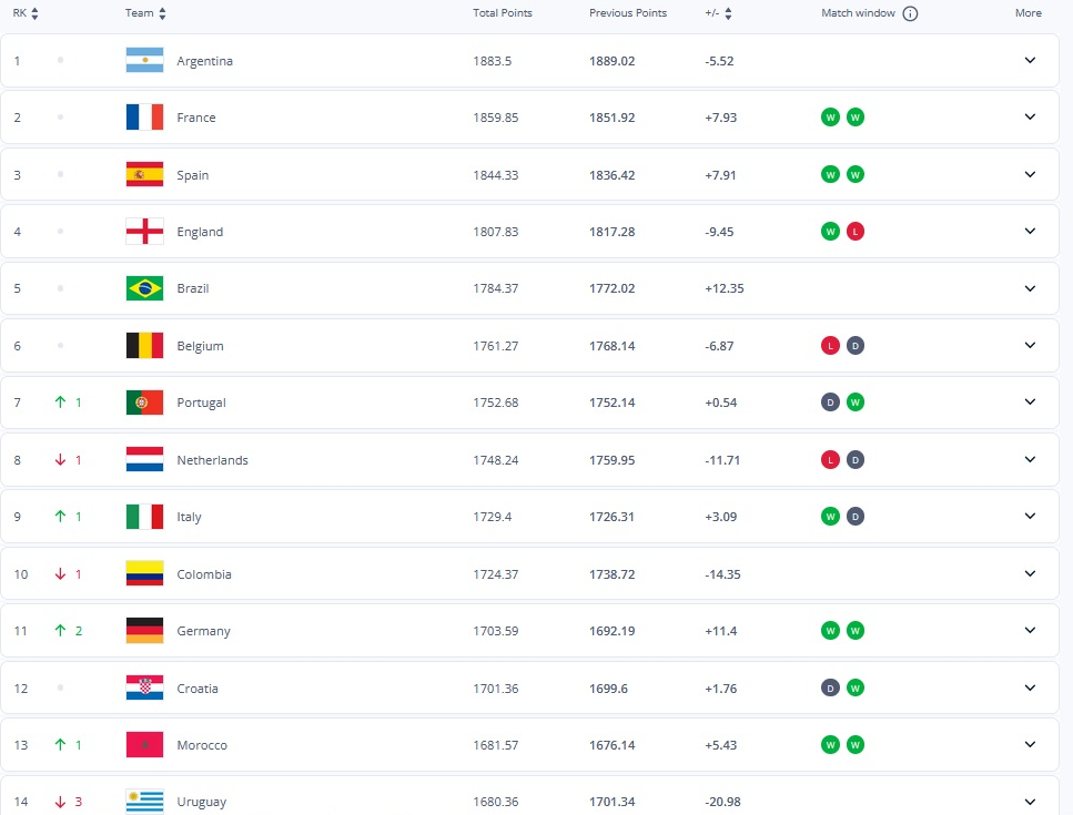 ФІФА оновила рейтинг збірних, згідно з яким національна команда України опустилася з 24-го місця на 25-те.
