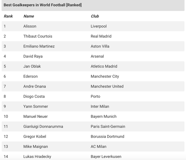 Give Me Sport представив оновлений список з 20 найкращих голкіперів світу.