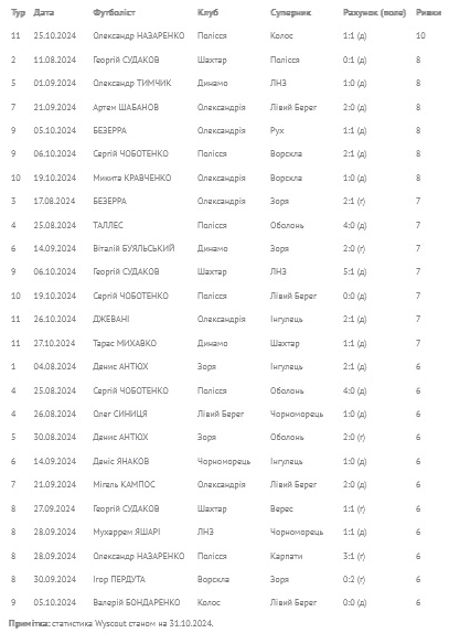 Дуже сильний результат видав у матчі 11-го туру з «Колосом» лівий вінгер «Полісся» Олександр Назаренко — оновив рекорд сезону-2024/25 в Чемпіонаті УПЛ, здійснивши 10 ривків із просуванням м’яча. Попереднє досягнення сезону — 8 ривків за матч — було встановлено Георгієм Судаковим ще у 2-му турі, після чого його п’ять разів повторювали. Востаннє — в 10-му турі — Микита Кравченко з «Олександрії».