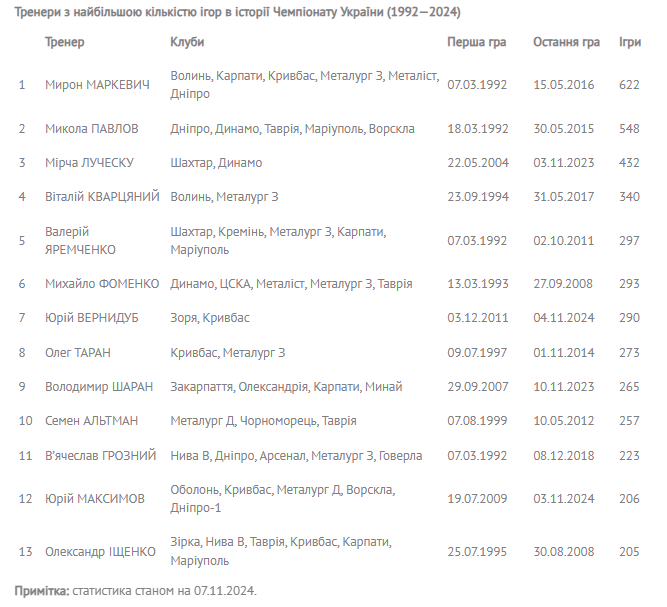 Очолює ж історичний список тренерів-гвардійців в Чемпіонатах України Мирон Маркевич — 622 гри біля керма шести клубів УПЛ.