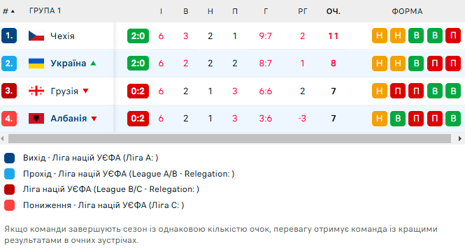 Збірна України - у зоні плей-оф. Турнірна таблиця станом на перерву в матчах заключного туру Ліги націй