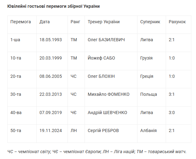 Перемога над Албанією (2:1) стала 50-ю для збірної України на чужих полях. 20 разів наша команда добивалася успіху в гостях у відбіркових турнірах чемпіонатів світу, по 13 – у відборах на Євро та у товариських зустрічах та 4 – у Лізі націй.