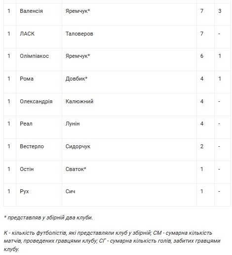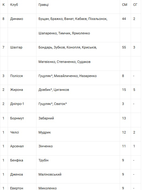 Найбільшу кількість футболістів делегували до збірної «Динамо» – 8 та «Шахтар» – 7. Динамівці провели загалом 44 матчі та забили 2 м'ячі, а гірники – відповідно 55 та 3.