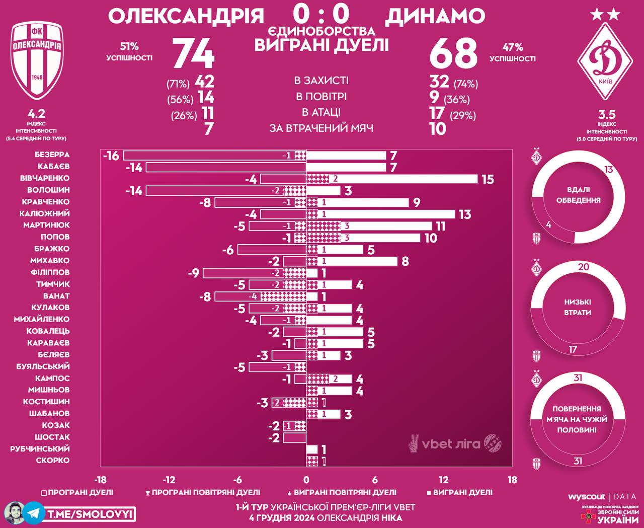 Напевно хтось вживатиме словосполучення «Динамо поступилося в боротьбі». В якості аргументу приводитимуться цифри виграних дуелей, де є перевага Олександрії (74:68). Проте це занадто поверхнево. В Динамо вищий відсоток:
