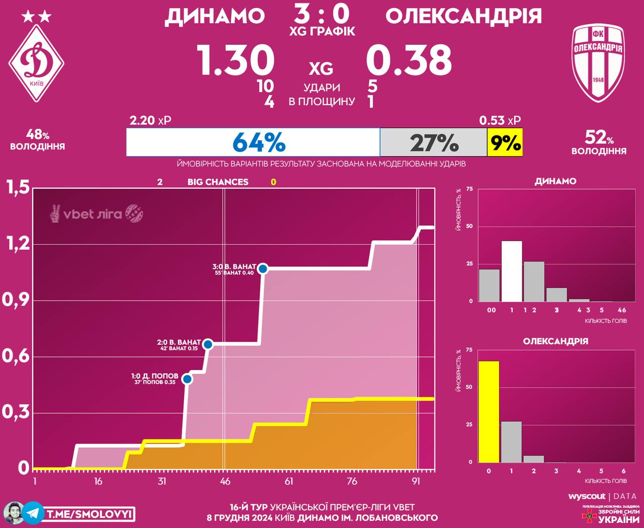 Динамо - 1.30 xG; 10 ударів (4 в площину) з середньої дистанції 16.0 метрів (2 з-за меж штрафного)