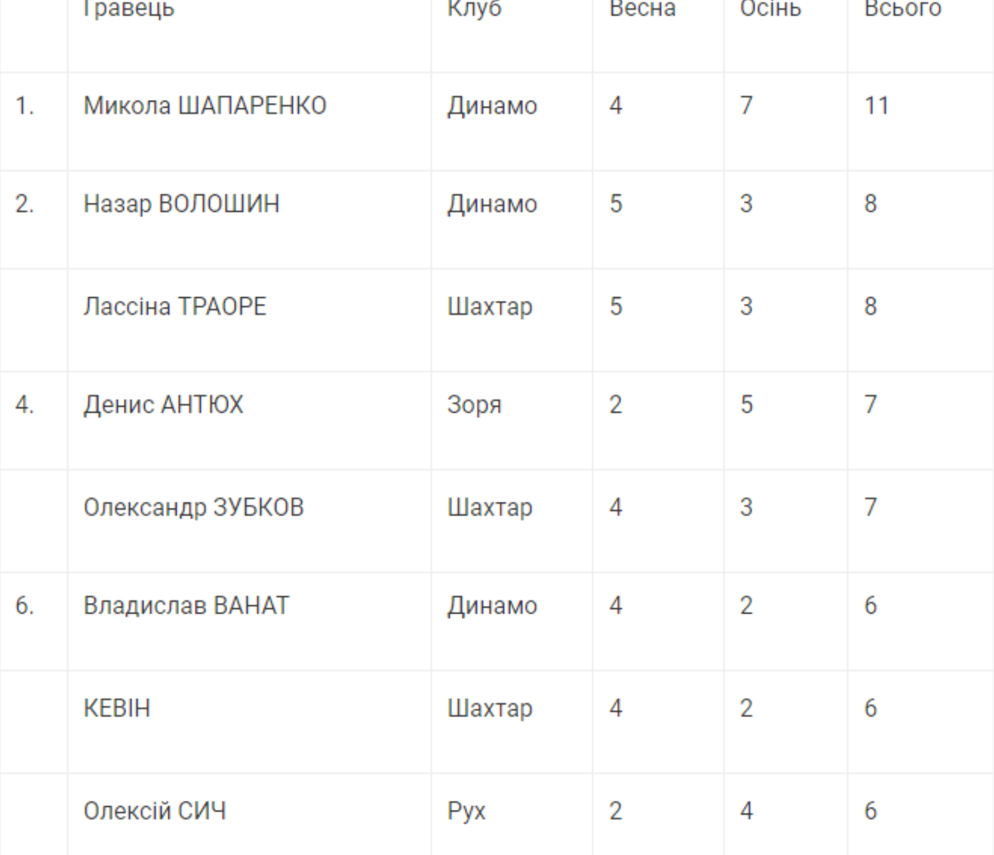 У Шапаренка назбиралося 11 асистів, тоді як у Назара Волошина та Лассіни Траоре - лише по 8 результативних пасів.