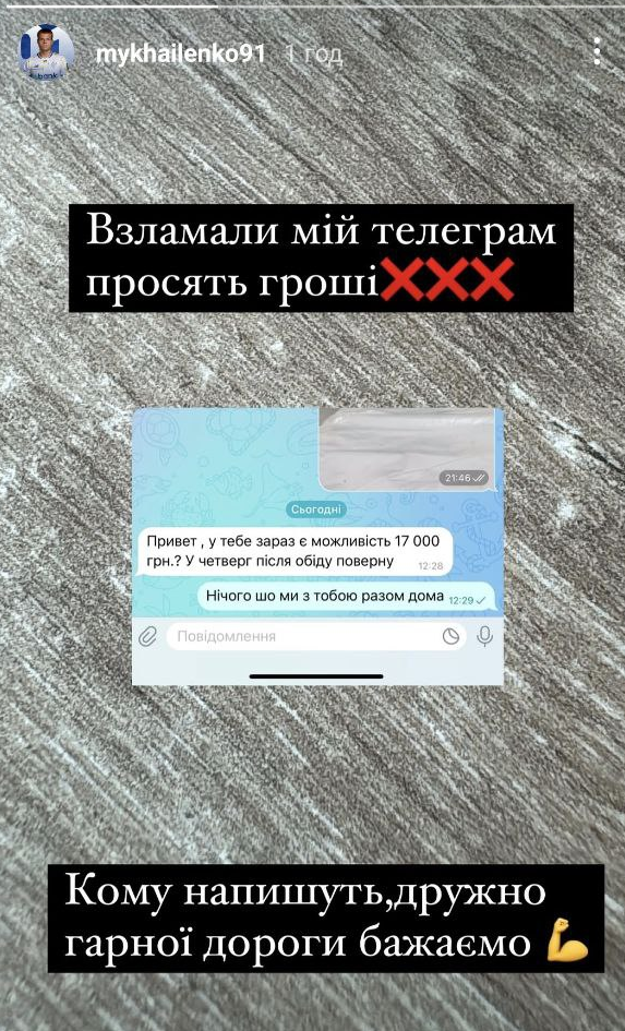 Півзахисник "Динамо" Микола Михайленко в Instagram повідомив про злам шахраями його профілю в Telegram.