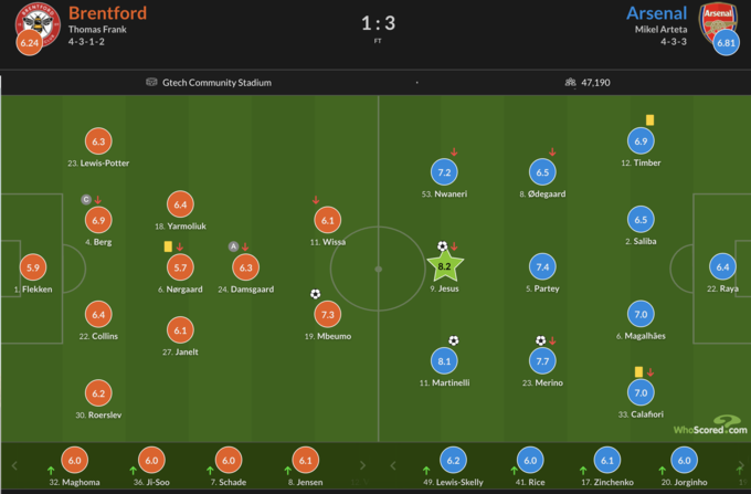 Ярмолюк та Зінченко отримали оцінки за гру "Брентфорд" - "Арсенал" від WhoScored