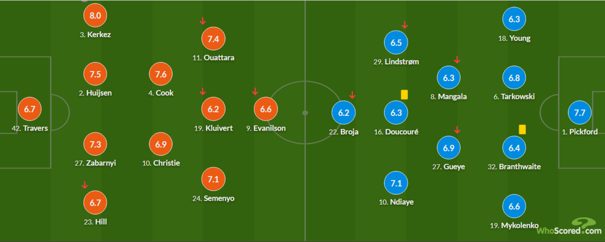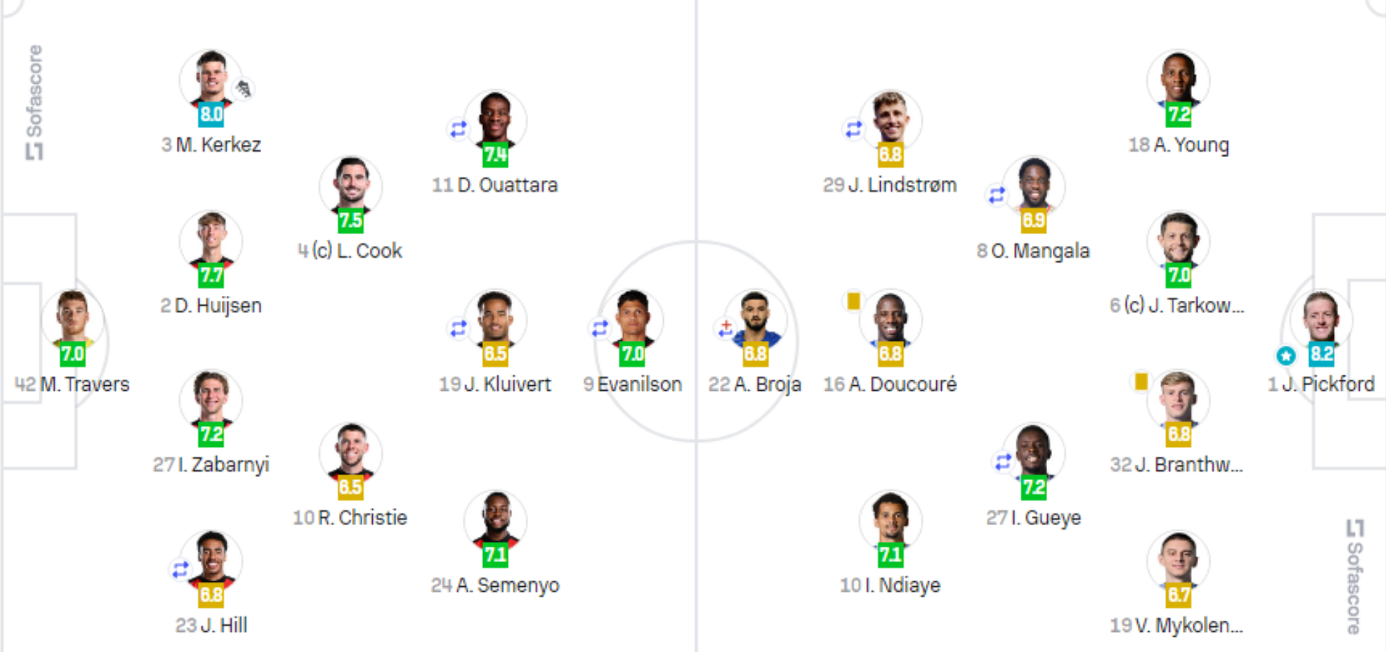"Борнмут" Забарного переміг "Евертон" Миколенка з рахунком 1:0. Sofascore поставила 7,2 Забарному та 6,7 - Миколенку.