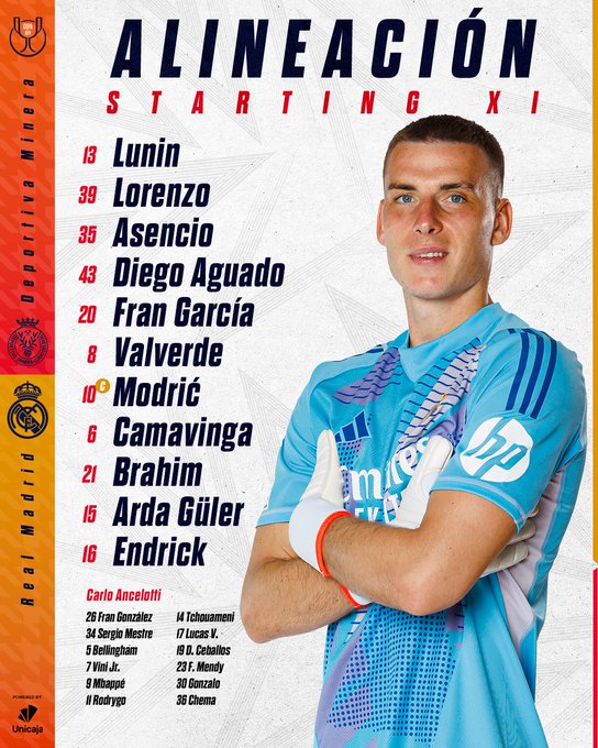 Голкіпер "Реала" Андрій Лунін вийде у стартовому складі мадридців на матч Кубка Іспанії проти "Депортіво Мінера".