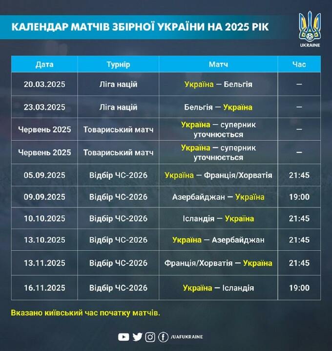 Команда Сергія Реброва проведе 10 матчів – два в Лізі націй, шість у відборі ЧС-2026 та ще два контрольні поєдинки (суперники поки не названі).