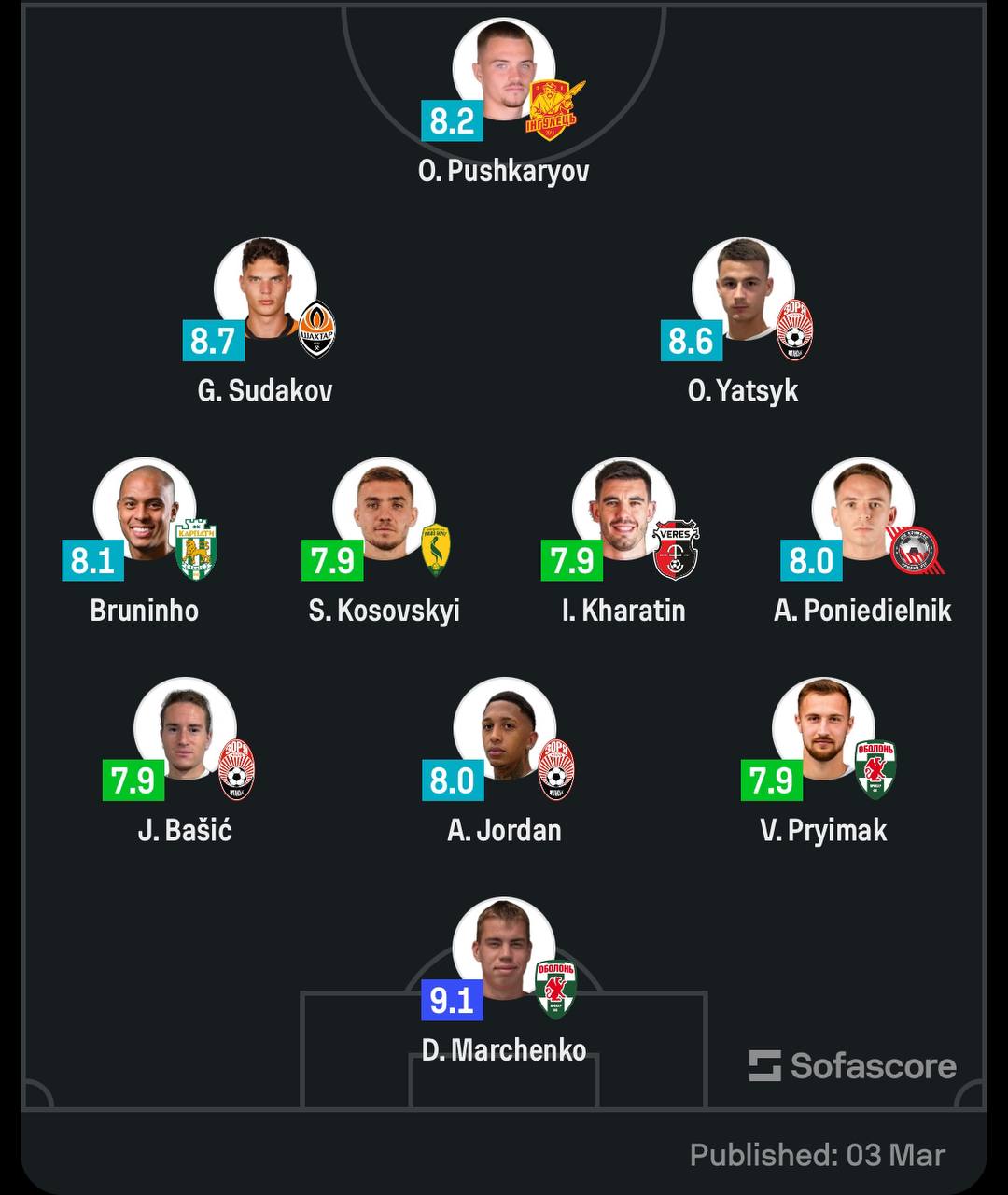 Жоден гравець "Динамо", який зараз виступає за основну команду киян, не потрапив до символічної збірної 19-го туру УПЛ від SofaScore.
