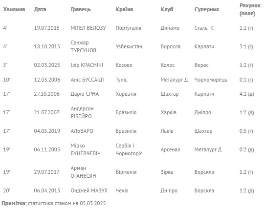 Найшвидші автоголи легіонерів в Чемпіонаті України (1992—2025)