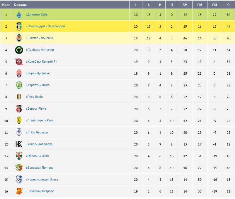 Пропонуємо до Вашої уваги турнірну таблицю Прем'єр-ліги після 20-го туру.