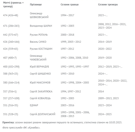 Матч 20-го туру проти «Шахтаря» став для керманича «Кривбаса» Юрія Вернидуба 400-м, проведеним в історії Чемпіонату України в статусі головного тренера (298 ігор) та гравця (102).