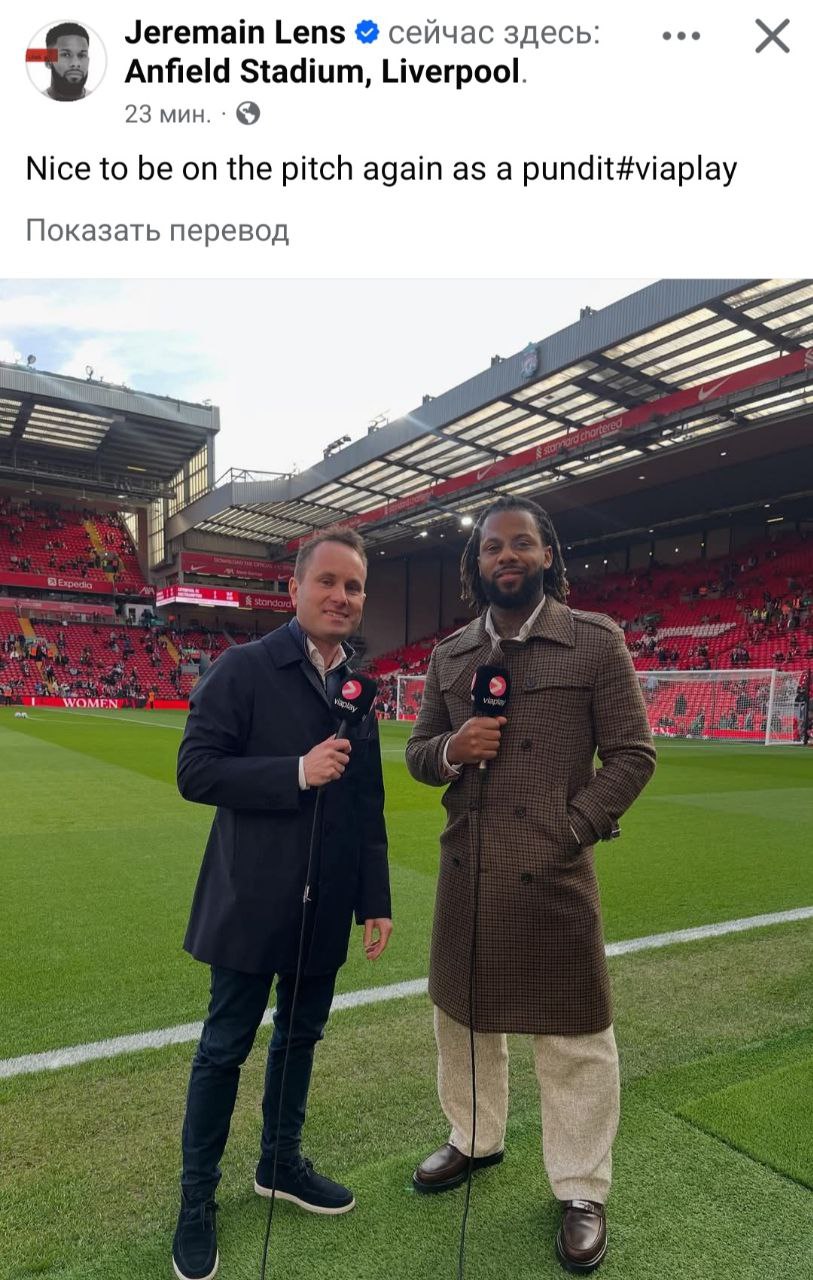 Колишній легіонер "Динамо" Джермейн Ленс побував на матчі "Ліверпуля" як експерт, про що написав на своїй сторінці у Facebook.