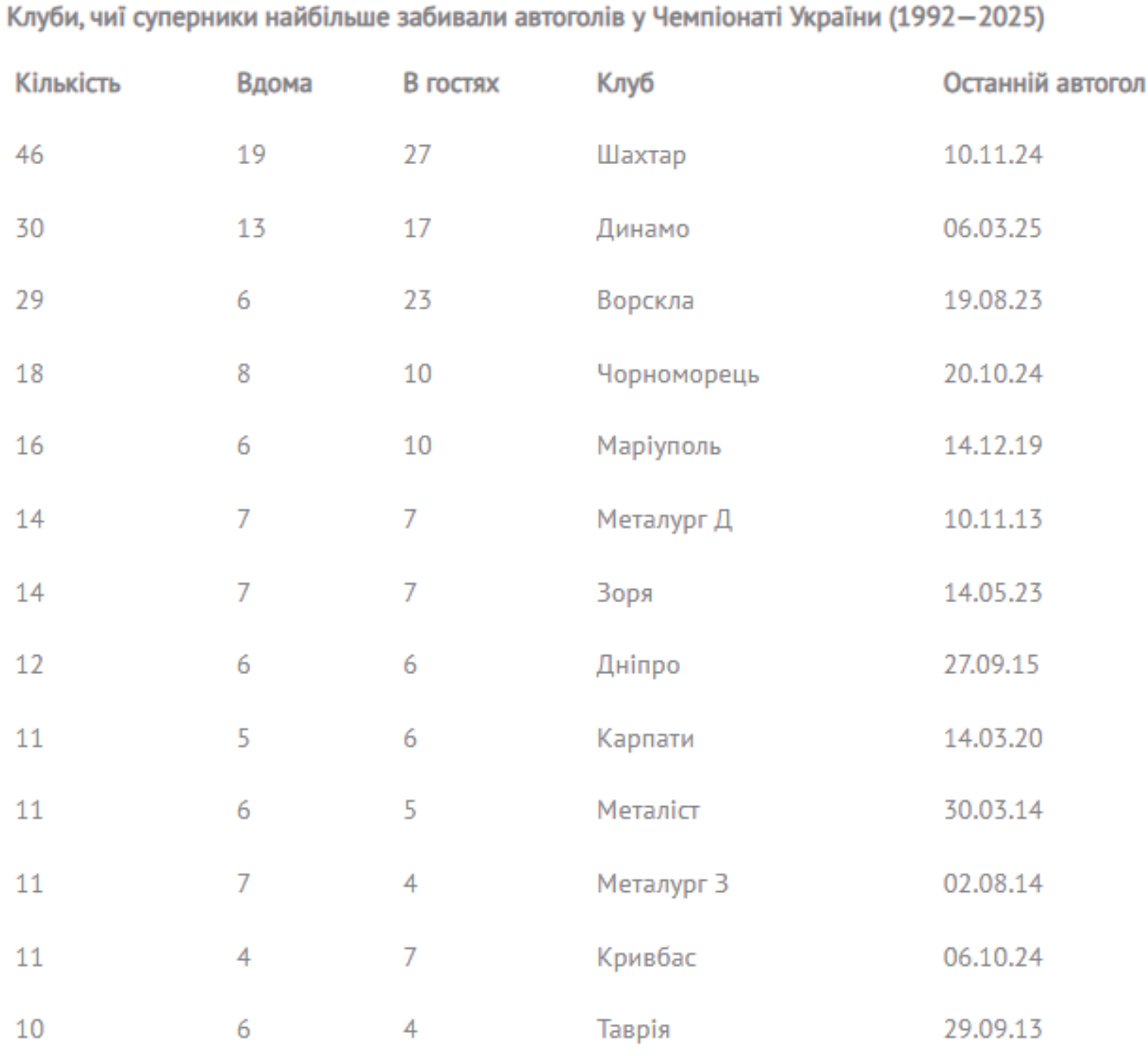 За кількістю результативних рикошетів суперників в УПЛ "Динамо" вийшло на друге місце, випередивши "Ворсклу". Загалом за всю історію чемпіонату України найчастіше серед 43-х клубів у власні ворота голи забивали суперники "Шахтаря" - 46 разів.