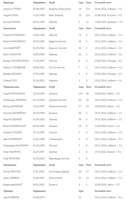 До резервного списку увійшли: воротар Георгій Бущан («Аль-Шабаб», Саудівська Аравія), захисники Денис Попов («Динамо») та Олександр Сваток («Остін», США), півзахисники Олександр Зубков («Трабзонспор», Туреччина), Владислав Кабаєв («Динамо») та Дмитро Криськів («Шахтар»).