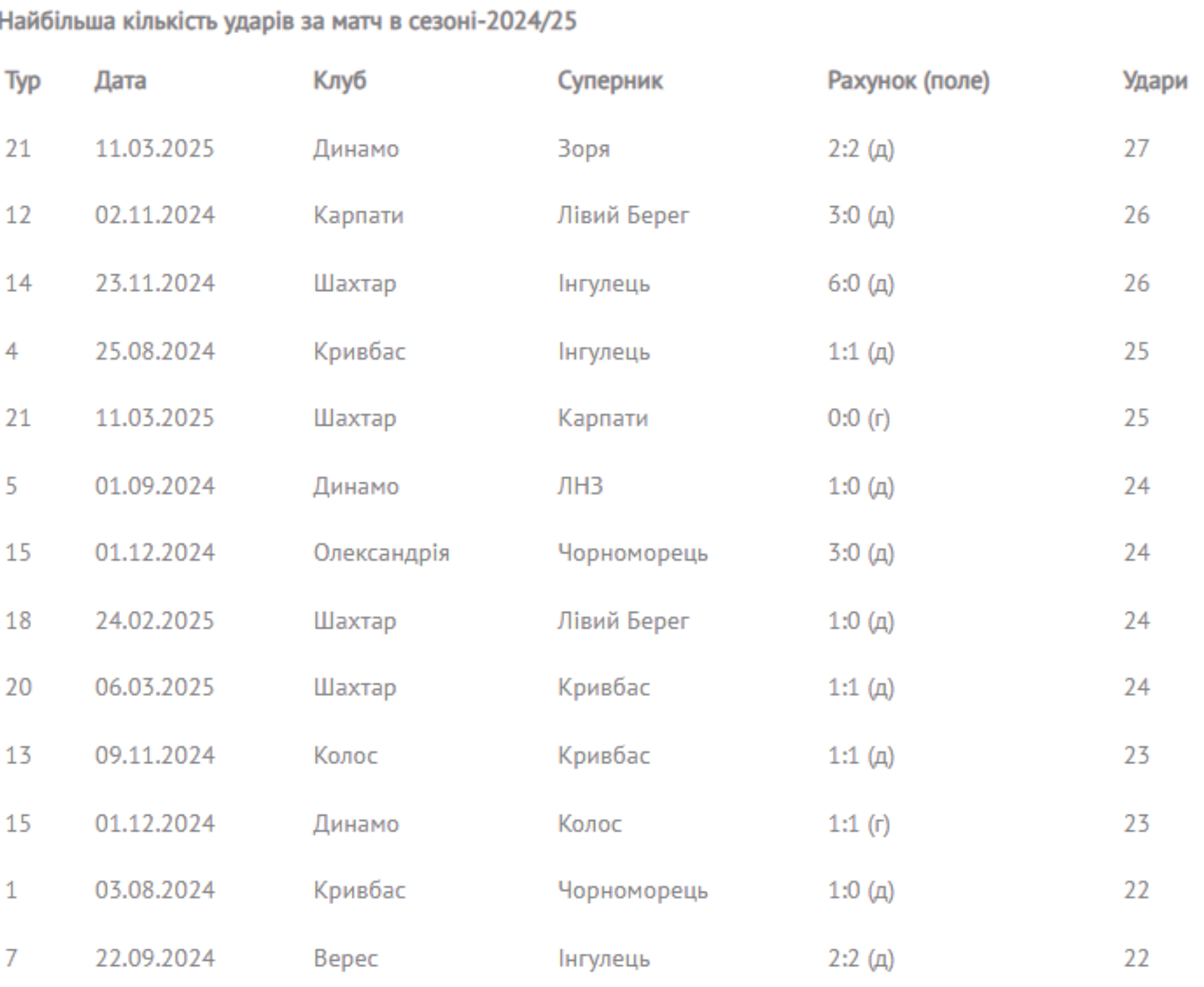 Після усіх проведених матчів сезону-2024/25 найкращими командами Чемпіонату УПЛ за середньою кількістю ударів по воротах є "Шахтар" (15,42 у перерахунку на 90 хвилин ігрового часу) та "Динамо" (15,29). До топ-5 також входять: "Кривбас" (11,85), "Олександрія" (11,76) та "Полісся" (11,54).