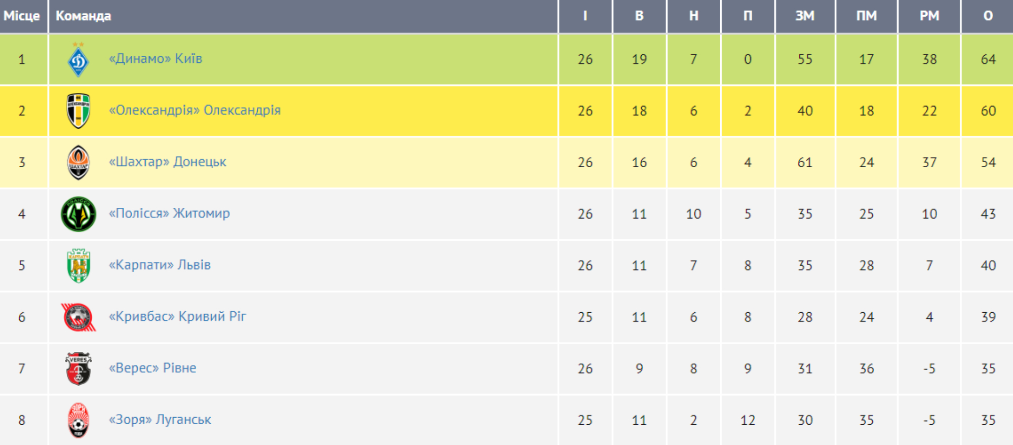 "Динамо" підпустило "Олександрію", але втримало на 10-очковій відстані "Шахтар". Турнірна таблиця УПЛ після 26-го туру