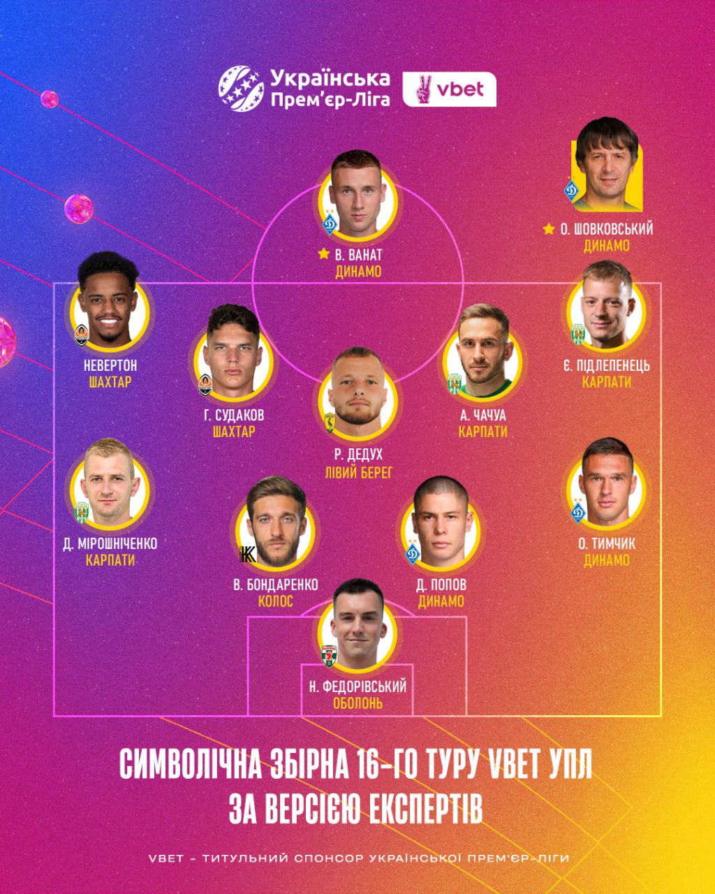 Три гравці "Динамо" увійшли до символічної збірної 16-го туру УПЛ. Ванат - найкращий гравець, Шовковський - найкращий тренер