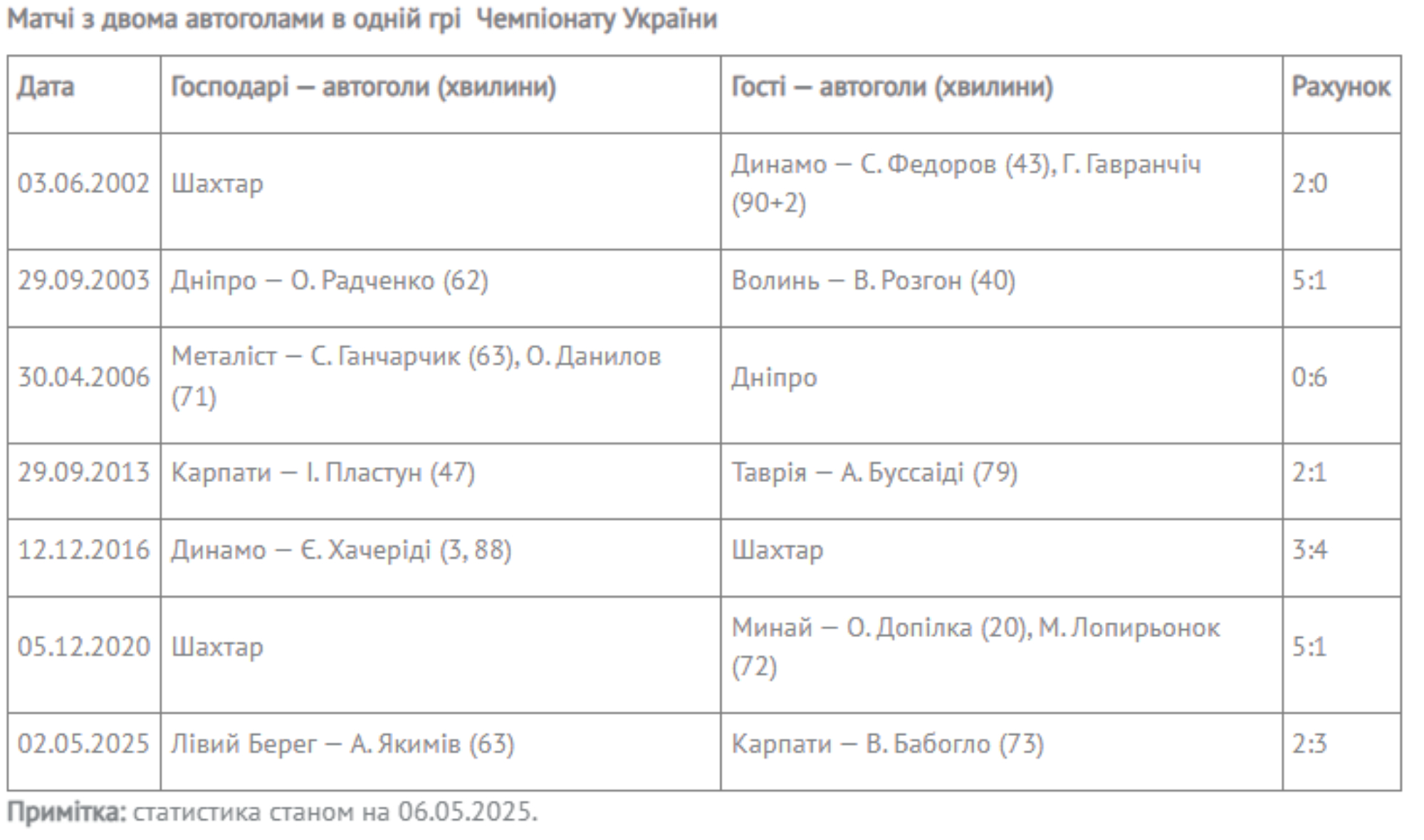 Це вже 7-й випадок в чемпіонаті України з рекордними двома "самострілами" в одному поєдину, в тому числі четвертий, коли обидва суперники "допомагали" забивати голи.