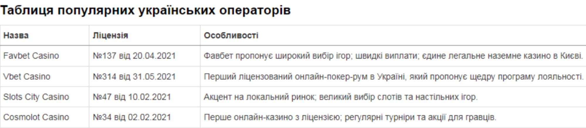 З моменту легалізації азартних ігор в Україні з'явилося багато операторів, які орієнтуються виключно на місцеву аудиторію. Вони пропонують гравцям ліцензовані послуги з широким вибором ігор і прозорими умовами. Нижче ви знайдете таблицю з інформацією про кілька таких брендів.