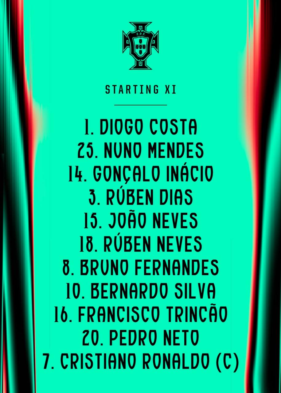 Португалія: Діогу Кошта, Жоау Невеш, Рубен Діаш, Гонсалу Інасіу, Нуну Мендеш, Рубен Невеш, Бернарду Сілва, Трінкау, Бруну Фернандеш, Нету, Роналду