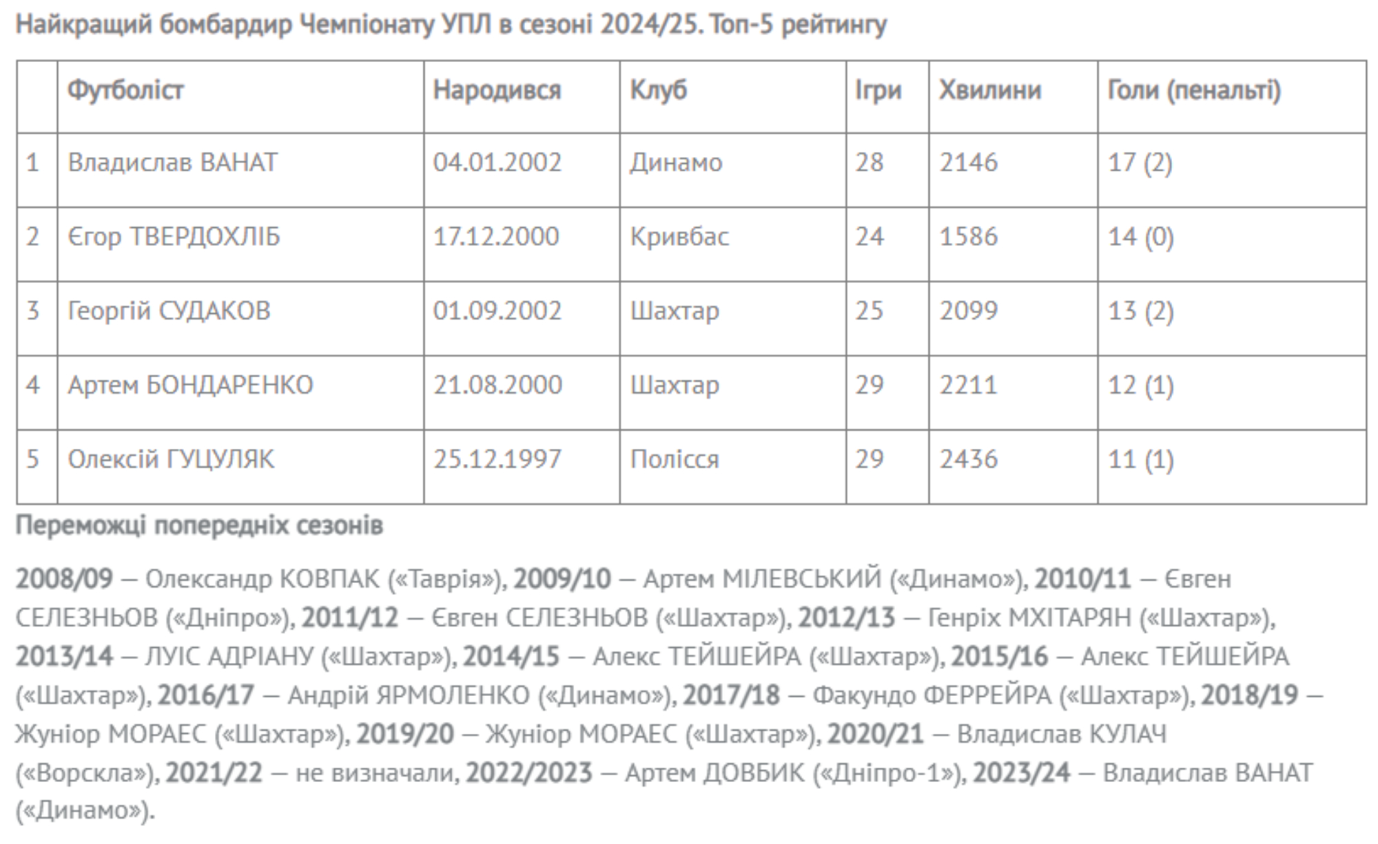 А ще УПЛ відзначає найкращого бомбардира сезону, але в цьому випадку все вирішує результативність окремого футболіста. І за підсумками минулого чемпіонату УПЛ найкращий результат за кількістю забитих м’ячів продемонстрував Владислав Ванат з "Динамо".