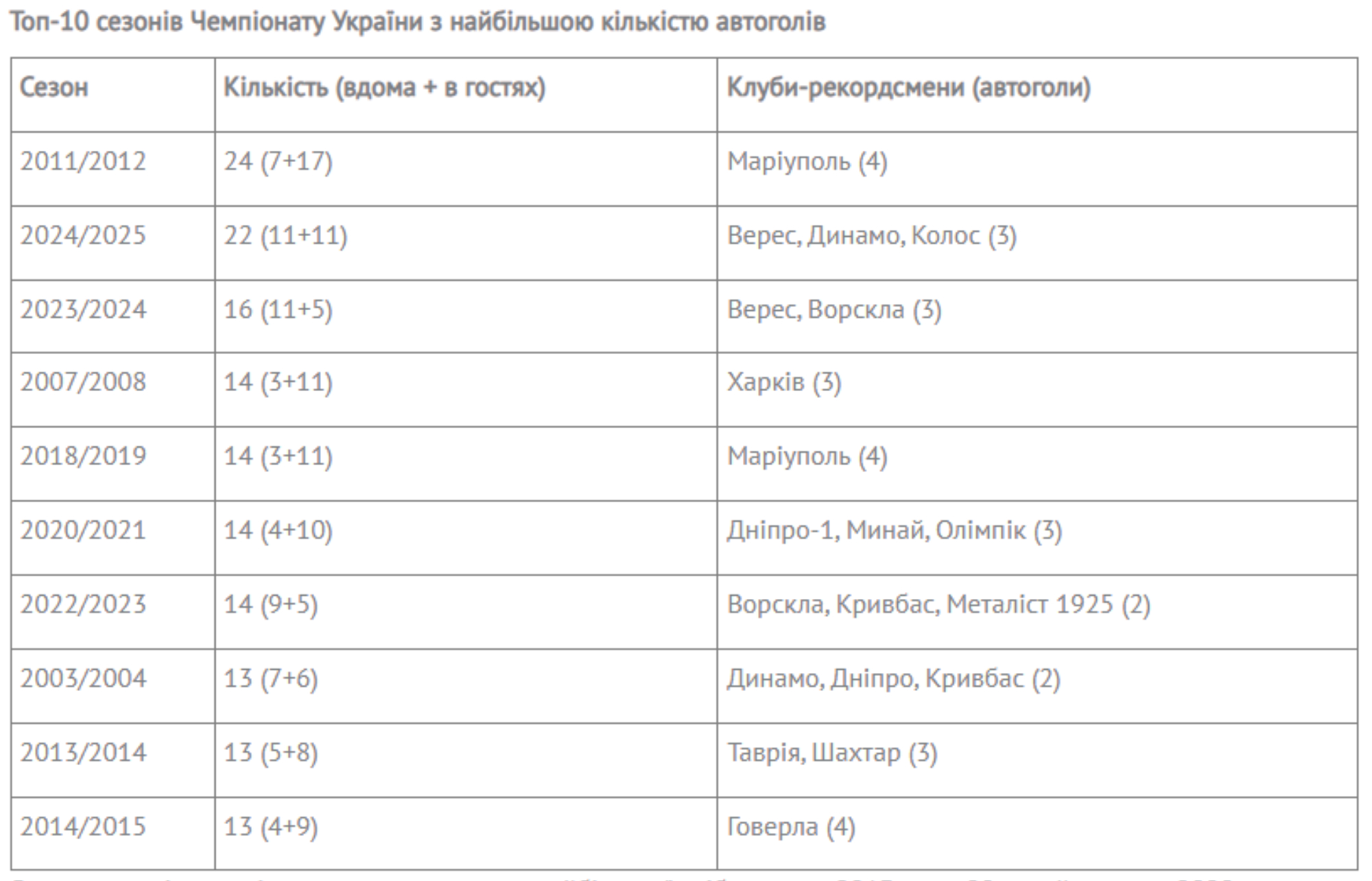 За кількістю автоголів чемпіонат-2024/2025 вийшов на 2-ге місце серед усіх 34-х сезонів.