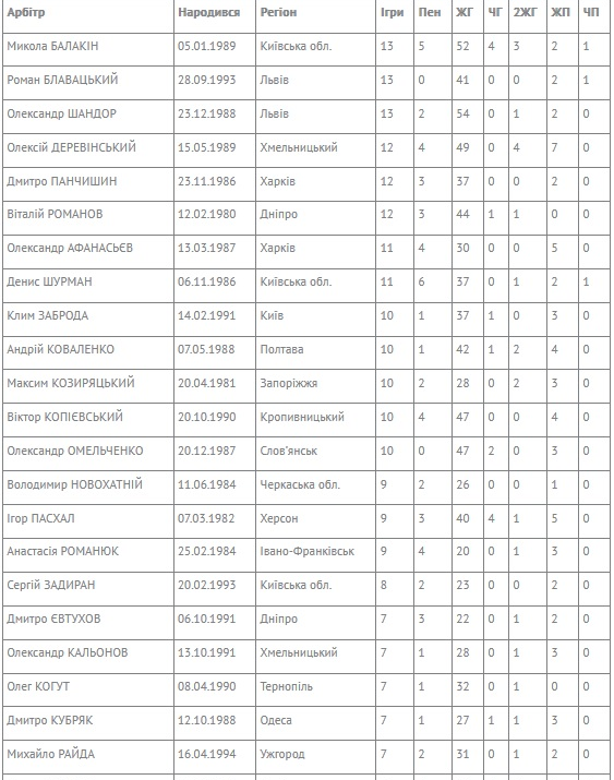 Найбільшу кількість матчів сезону у Прем'єр-лізі провели арбітри з Київщини та Львова